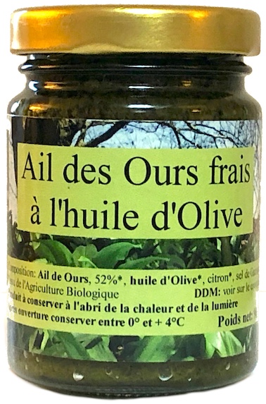Il est certifié Bio Ecocert puisque entièrement présent sur notre propriété. Notre ail des ours frais à l’huile d’olive est en vente dans les magasins bio, les épiceries fines et parfois les lieux fréquentés par les touristes qui y trouvent là un achat joignant l’utile à l’agréable.